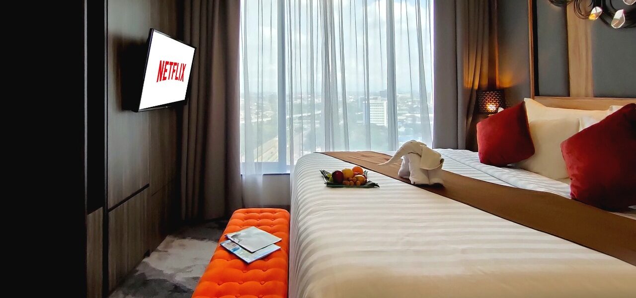 Melihat kebutuhan akomodasi hotel sebagai rumah kedua bagi para tamu dalam melaksanakan aktivitasnya dalam perjalanan bisnis maupun sebagai sweet gateway di kala weekend, hotel yang sebentar lagi akan upgrade bintang dari bintang tiga plus ke bintang empat ini telah menyediakan fasilitas tambahan untuk memanjakan para tamunya. Fasilitas tersebut adalah Room Entertainment, dimana para tamu akan dimanjakan dengan fitur IPTV, dimana dalam satu genggaman remote control, tamu dapat memilih hiburan visual favoritnya untuk mengisi quality time nya selama menginap di hotel. Mulai dari nonton film di Netflix ataupun Disney Hotstar, serta dapat juga menonton channel favoritnya di Youtube.